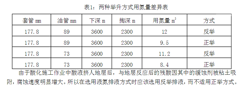 在預定的排液深度較深時,正舉排液用液氮量要少于反舉排液時的用液氮量,但是在預定的排液深度較淺時,反舉排液用液氮量就要小于正舉排液的用氮量了(見表1)。