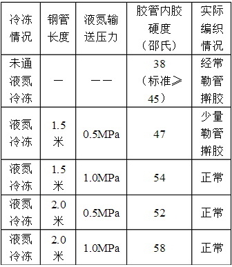 確定了采用液氮冷凍技術(shù),我廠開始設(shè)計冷凍段。以編織膠管為例,每根膠管可長達100米左右,為了提高冷凍效果,我們采用長的鋼鐵管道作為液氮流入、輸出膠管渠道,兩端管口使用海綿封堵,減少液氮的流失。確定冷卻段后,進行冷凍試驗,并進行檢驗,選用**佳方案。試驗結(jié)果如表二: